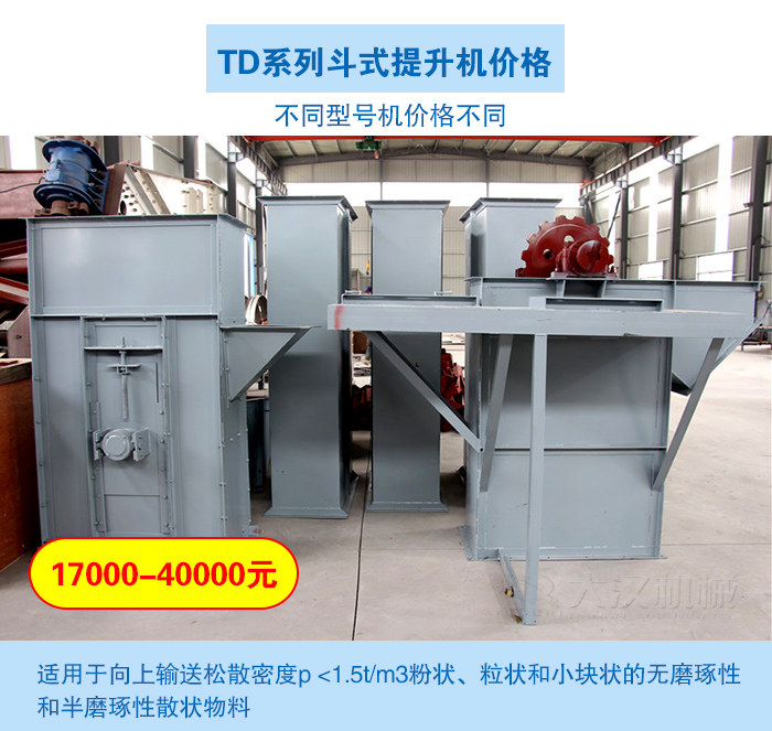 TD斗式提升機適用于向上輸送松散密度p <1.5t/m3粉狀、粒狀和小塊狀的無磨琢性和半磨琢性散狀物料,如煤、砂、焦末、水泥、碎礦石等,輸送量達400m³/h,輸送高度可達40m,該系列斗式提升機型號從160到400,不同型號尺寸的TD系列斗式提升機價格不同。