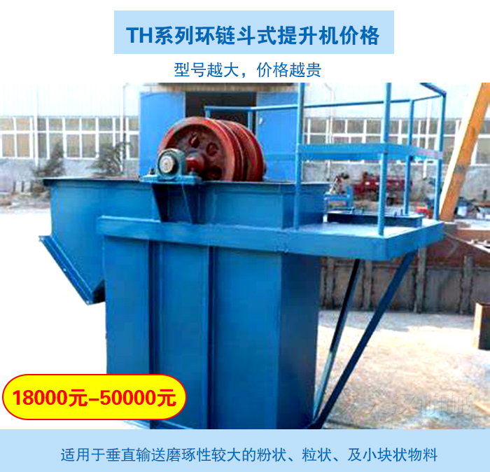 TH系列環(huán)鏈斗式提升機適用于垂直輸送磨琢性較大的粉狀、粒狀、及小塊狀物料,如糧食、煤、水泥、碎礦石等,輸送高度高40m,型號有TH315、TH400、TH500、TH630、TH800、TH1000,型號越大,價格越貴。