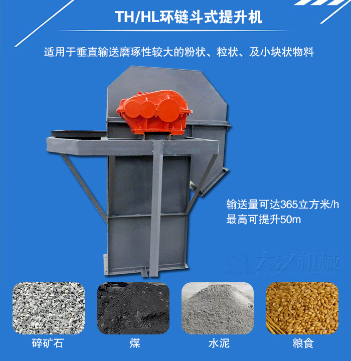 TH/HL環(huán)鏈斗式提升機(jī)牽引機(jī)構(gòu)是兩根環(huán)形鏈條,為混合或重力方式卸料,掏取式裝料,輸送量可達(dá)365m³/h,高可提升50m。