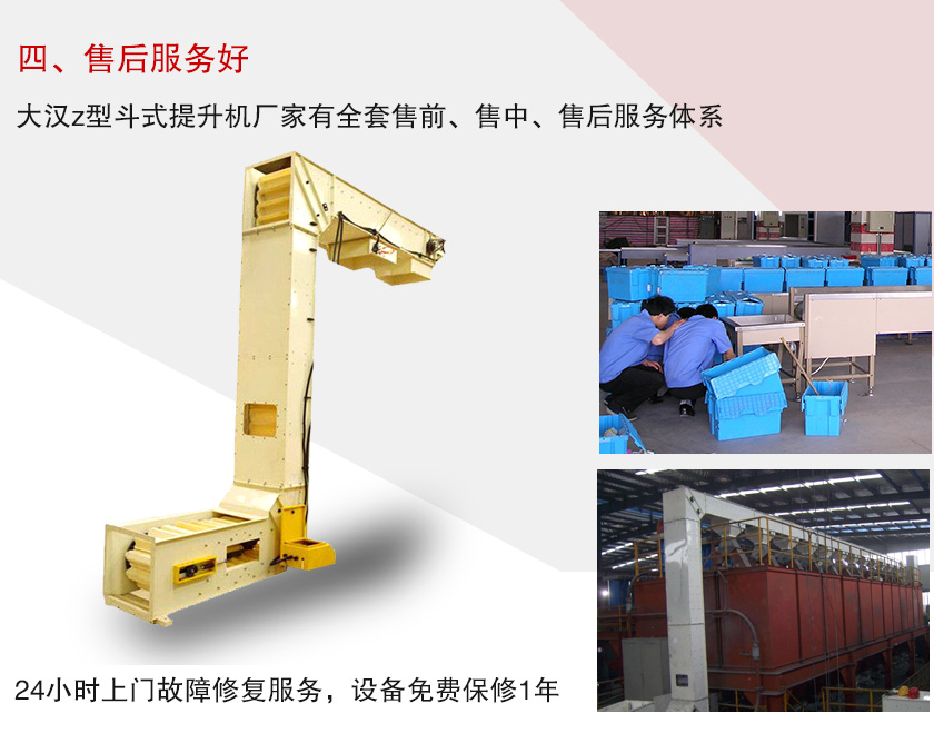 有些廠家在在設(shè)備賣出后就不負責后續(xù)事項,如設(shè)備故障維修,維護保養(yǎng)技巧培訓(xùn)等等,這樣會大大增加用戶的成本,大漢z型斗式提升機廠家有全套售前、售中、售后服務(wù)體系,設(shè)備售后環(huán)節(jié)我們有專門的售后服務(wù)人員實施跟蹤回訪,了解設(shè)備使用情況,并培訓(xùn)相關(guān)的維護保養(yǎng)方案,24小時上門故障修復(fù)服務(wù),設(shè)備免費保修1年。