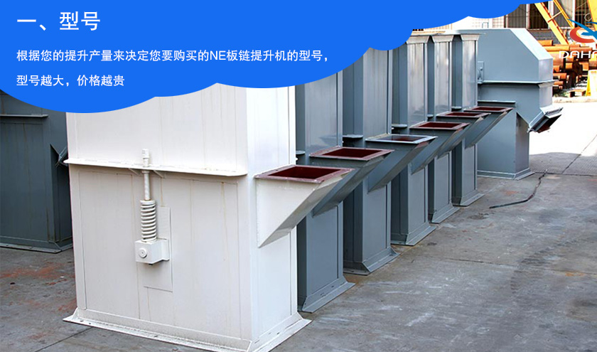 NE板鏈提升機(jī)的型號:NE15、NE30、NE50 、NE100、NE150、NE200、NE300、NE400、NE500、NE600、NE800等多種,NE代表是板鏈提升機(jī),數(shù)字代表的是提升產(chǎn)量(方),所以可以根據(jù)您的提升產(chǎn)量來決定您要購買的NE板鏈提升機(jī)的型號,型號越大,價格越貴。