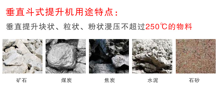 垂直斗式提升機(jī)系采用板式套筒滾子鏈為牽引構(gòu)件,料斗固定在鏈板上并連續(xù)布置,用流入式裝載,低速重載卸料的斗提機(jī)。本機(jī)適用于輸送中等及大塊狀的、易碎的和磨琢性的堆積密度小于2t/m3的物料,物料溫度不超過(guò)2500C,如塊煤、礦石、卵石、焦碳等。