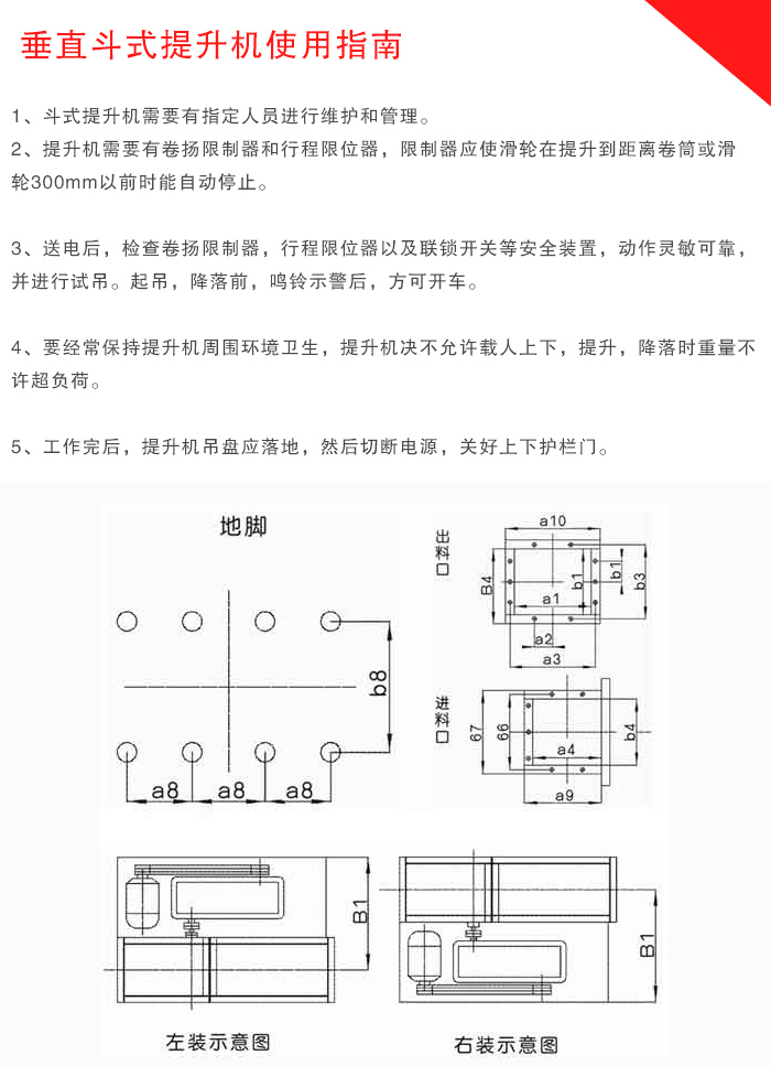 4、要經(jīng)常保持提升機(jī)周圍環(huán)境衛(wèi)生,提升機(jī)決不允許載人上下,提升,降落時(shí)重量不許超負(fù)荷。