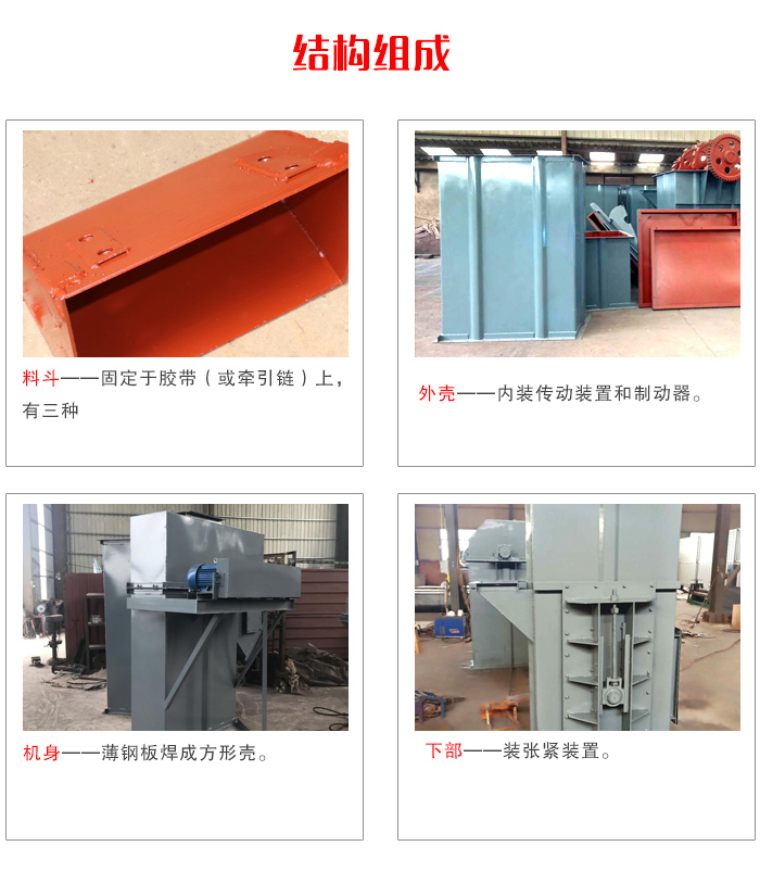 料斗:固定于膠帶(或牽引鏈)上,有三種:深斗(適合于松散物料),淺斗(黏性較大的物料),三角斗(比重大且成塊狀的物料)。