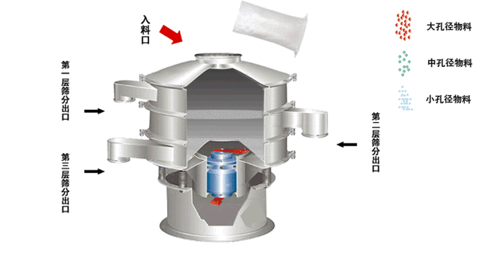 由直立式振動電機作為激振源,電機上、下兩端安裝有偏心重錘,將電機的旋轉運動轉變?yōu)樗?、垂直、傾斜的三次元運動,再把這個運動傳遞給篩面進行篩分。調節(jié)上、下兩端的相位角,可以改變物料在篩面上的運動軌跡。
