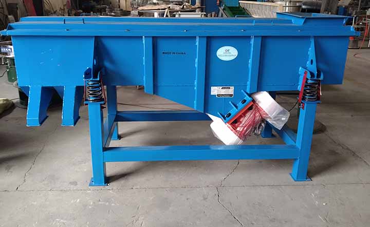 525-4P直線振動篩主要由篩箱、篩框、篩網、振動電機、電機臺座、減振彈簧、支架等組成。