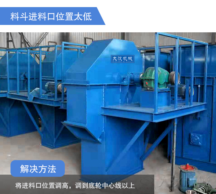 斗式提升機(jī)料斗自行盛取從進(jìn)料口進(jìn)來(lái)的物料,如果其進(jìn)料口太低,在導(dǎo)致料斗來(lái)不及盛取物料,而物料大部分進(jìn)入機(jī)座,造成料斗舀取物料了,而斗式提升機(jī)提升的物料多為塊狀,就很容易引起料斗變形、脫落。