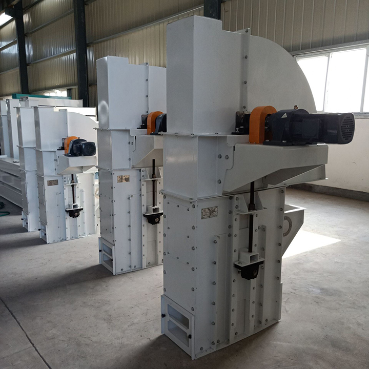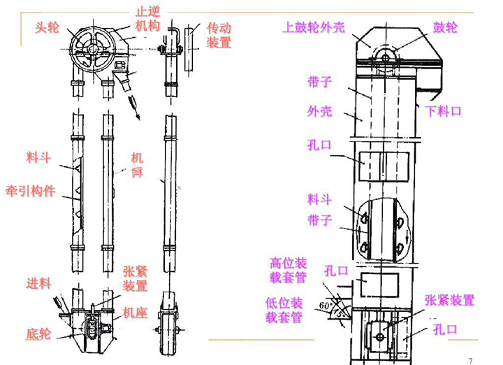 石灰石斗式提升機主要由機頭部、機尾部、牽引構件、料斗構成。機頭部是驅動和卸料區(qū)域。主要包括驅動裝置、驅動輪、卸料口以及頭部外殼,提供提升動力。機尾部主要包括改向輪、張緊裝置、進料口以及尾部外殼。牽引構件是傳遞動力的載體,常見的有高強度橡膠輸送帶和圓環(huán)鏈/板鏈。料斗是承載物料的容器,按一定間距固定在牽引構件上。根據(jù)物料特性有深斗、淺斗、導向邊斗、鱗板斗等多種形式。