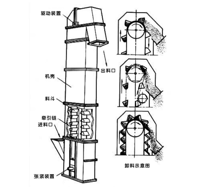 工業(yè)廢料斗式提升機的垂直提升高度在5米至50米左右,處理量根據(jù)機型大小一般在5至500立方米/小時之間。進出料方式為下部是掏取式或流入式進料,上部為離心式或重力式出料。設備的部件如料斗常用耐磨鋼,對于腐蝕性的環(huán)境可用不銹鋼或表面防腐處理,牽引件多選用高強度橡膠帶或耐磨錳鋼鏈條,而機殼及頭尾輪軸等部件則采用碳鋼并進行防腐處理或直接使用不銹鋼材質。