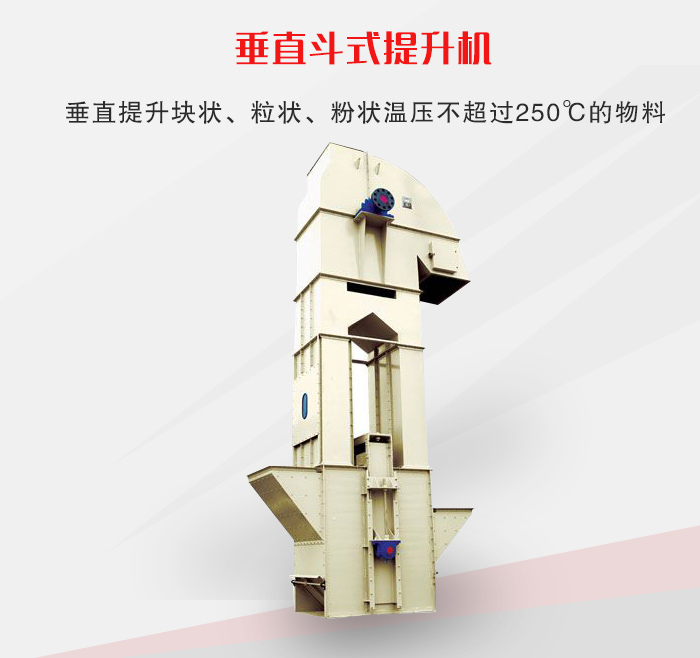 垂直斗式提升機(jī)系采用板式套筒滾子鏈為牽引構(gòu)件,料斗固定在鏈板上并連續(xù)布置,用流入式裝載,低速重載卸料的斗提機(jī)。本機(jī)適用于輸送中等及大塊狀的、易碎的和磨琢性的堆積密度小于2t/m3的物料,物料溫度不超過(guò)2500C,如塊煤、礦石、卵石、焦碳等。