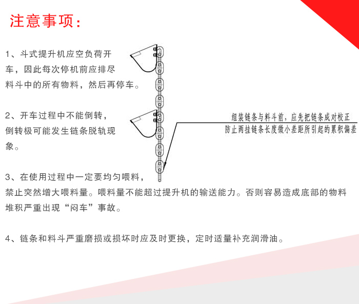 4、鏈條和料斗嚴(yán)重磨損或損壞時(shí)應(yīng)及時(shí)更換,定時(shí)適量補(bǔ)充潤(rùn)滑油。