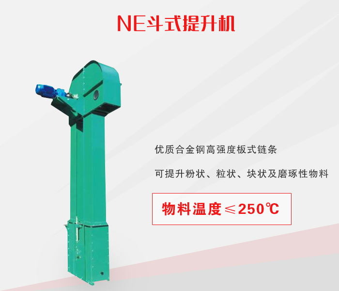 NE斗式提升機(jī)是流入式喂料,物料流入料斗內(nèi)靠板鏈提升到頂端,在物料重力作用下自行卸料。本系列提升機(jī)規(guī)格多(NE15~NE800共11種)提升量大;且生產(chǎn)能高,能耗較低,可逐步代替其他類(lèi)型提升機(jī),其主要參數(shù)見(jiàn)下表。該機(jī)采用全封式機(jī)殼鏈速低,幾乎無(wú)回料現(xiàn)象,因此無(wú)功功率損耗少,噪聲低,壽命長(zhǎng)。